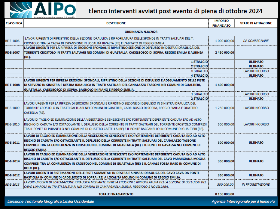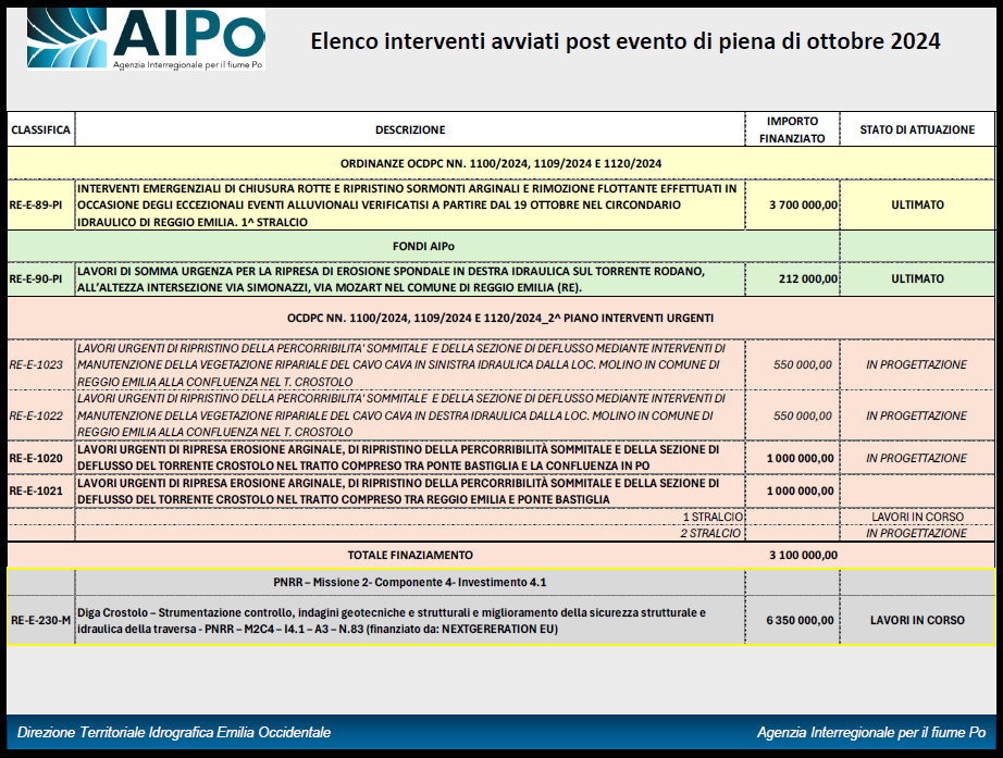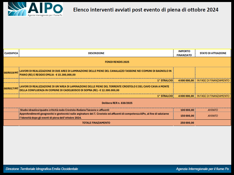 Nelle tabelle riportate di seguito sono presentati estratti sintetici delle slide illustrate dal Direttore di AIPO, contenenti l’elenco degli interventi avviati e delle attività attualmente in corso a seguito dell’evento di piena dell’ottobre 2024, tra cui alcune azioni di particolare rilievo per il miglioramento della sicurezza del territorio, quali: